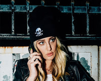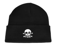Stay cozy in the Black Skull Embroidery Beanie. Black knit beanie with white embroidered skull logo.
