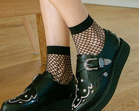 Go bold with your look in these fishnet crew socks cut above the ankle in a diamond fishnet pattern. Has banded cuffs and lined footbed and toe.