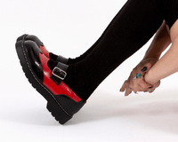The T.U.K. Brogue Mary Jane. Black & Red Leather, with Brogue Punched Details, a Silver Metal Buckle, and a 1 1/2 inch Heel.