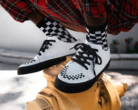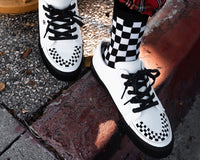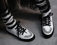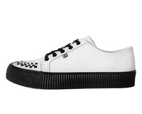 Lace-up and go! A new classic! The White leather Lace-Up Creeper Sneaker features a white leather upper with black interlace and 5 eyelets. Has classic T.U.K. creeper ridged sole at a height of 1 1/4". Include mesh lining and memory foam insole for added comfort.