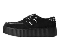 Hey there stud. Go for bold in these killer creepers featuring a black suede upper with stud and zipper detailing. Has a lightweight VIVA mondo creeper platform sole that measures approximately 1 ¾” at the heel and 1 ¼” in the front. Comes with removable memory foam padding for added comfort.