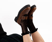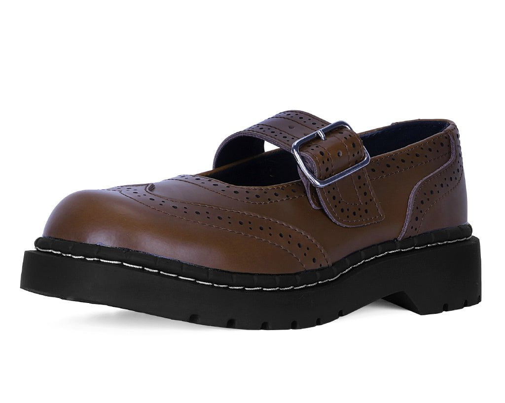 The T.U.K. Brogue Mary Jane. Brown Leather, with Brogue Punched Details, a Silver Metal Buckle, and a 1 1/2 inch Heel.
