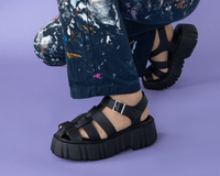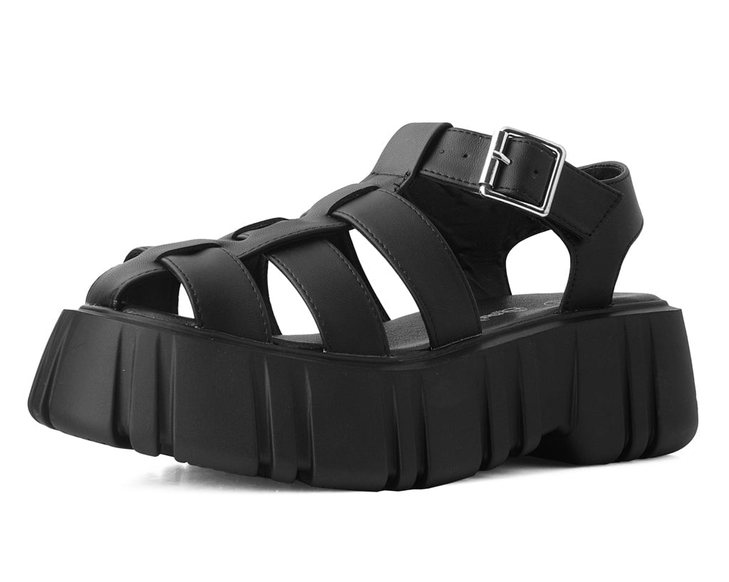Discover your inner rebel with the Gladiator Anarchic Airship Sandal. These alternative sandals feature strappy details and an edgy design, taking you on a journey of style and comfort. Dare to stand out and make a statement! Has an all-black upper made of our high quality TUKskin™ material and a platform height that stands at 2.5”.