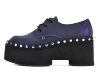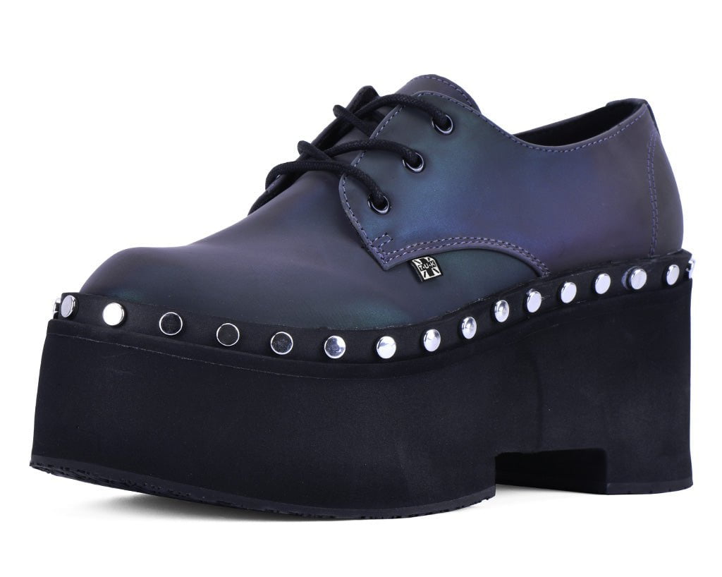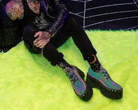 Holographic style. The Midnight Chameleon Dino Flat Platform features a vegan friendly reflective color-shifting upper and a 3-eyelet lace-up detailing. Our new "Dino Flat" sole features a flat studded rim, standing at a height of 2 inches at the toe and 3 inches at the heel.