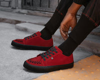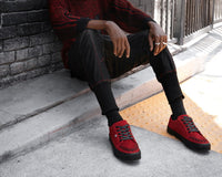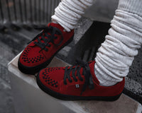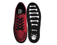 Lace-up and go! A new classic! The Red Suede Lace-Up Creeper Sneaker features a red suede upper with black interlace and 5 eyelets. Has classic T.U.K. creeper ridged sole at a height of 1 1/4". Include mesh lining and memory foam insole for added comfort.