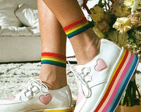 Super cute white sheer socks featuring a rainbow top band. Lined at toe and heel.