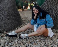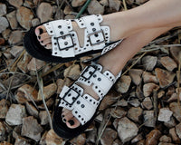 Wear them your way. Features 2 White TUKskin (vegan friendly) Buckle straps, upper has embellishments of flat metal studs. Sits on our lightweight VIVA mondo sole that is approximately 1 ¾” at the heel and 1 ¼” in the front.